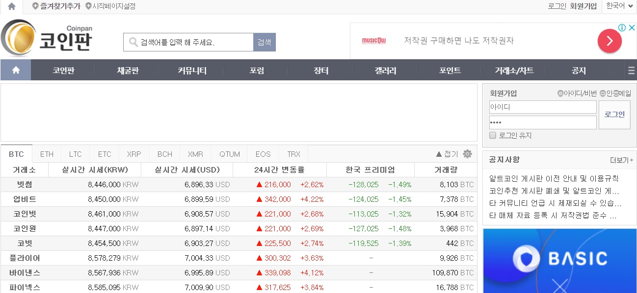* 국내 가상화폐 커뮤니티 등 가장 큰 사이트입니다. 팝업에 국내, 외 거래소의